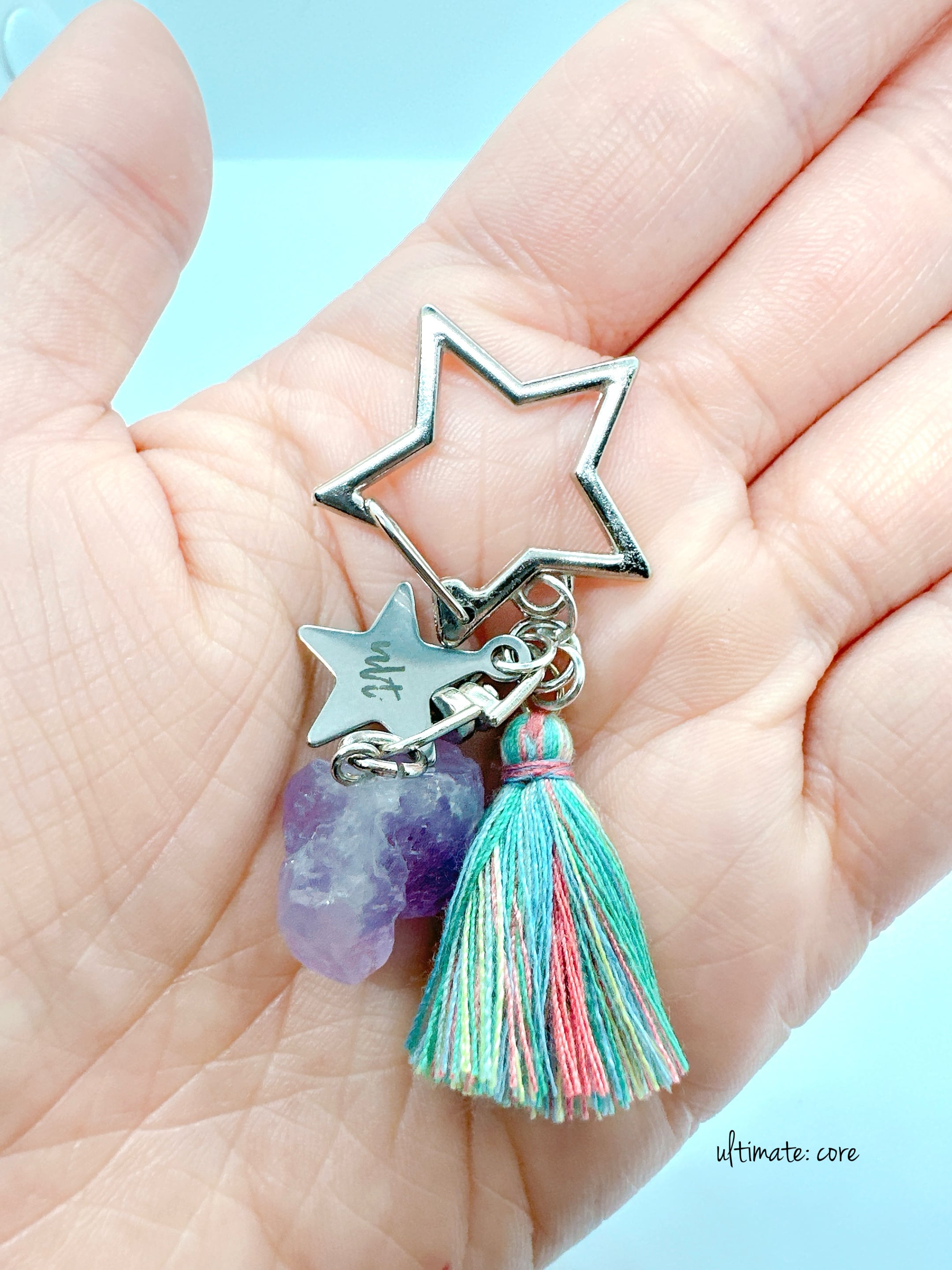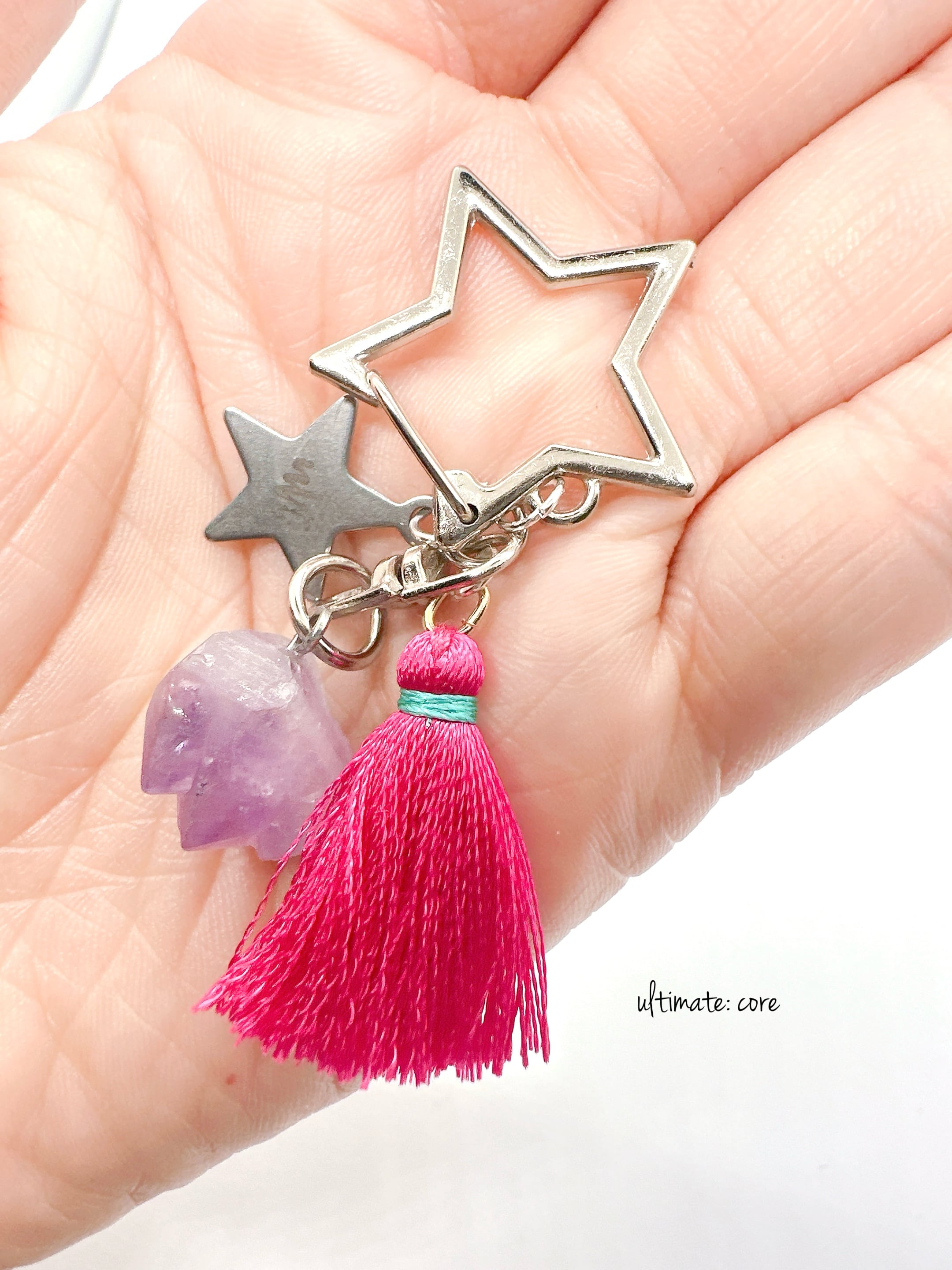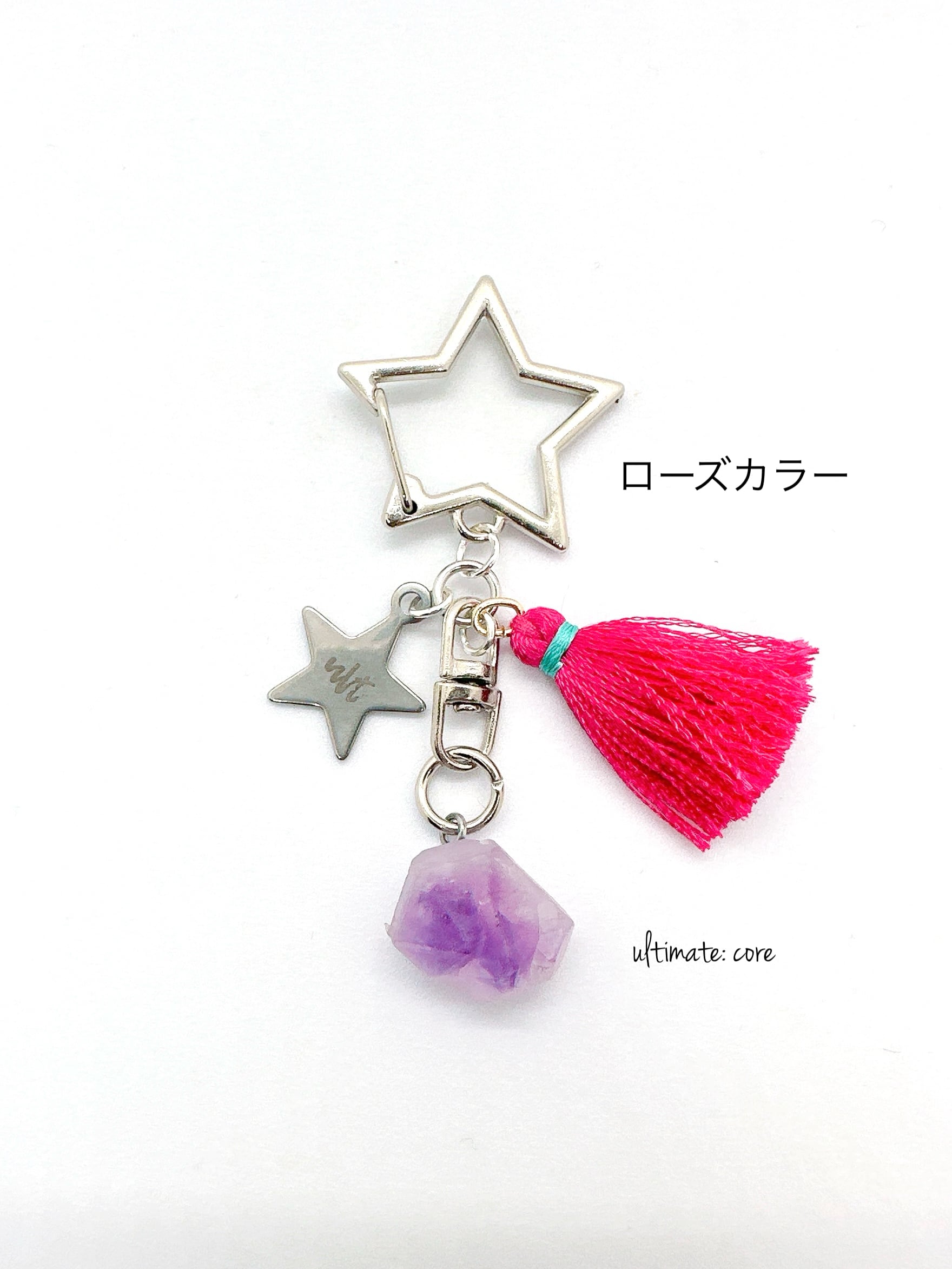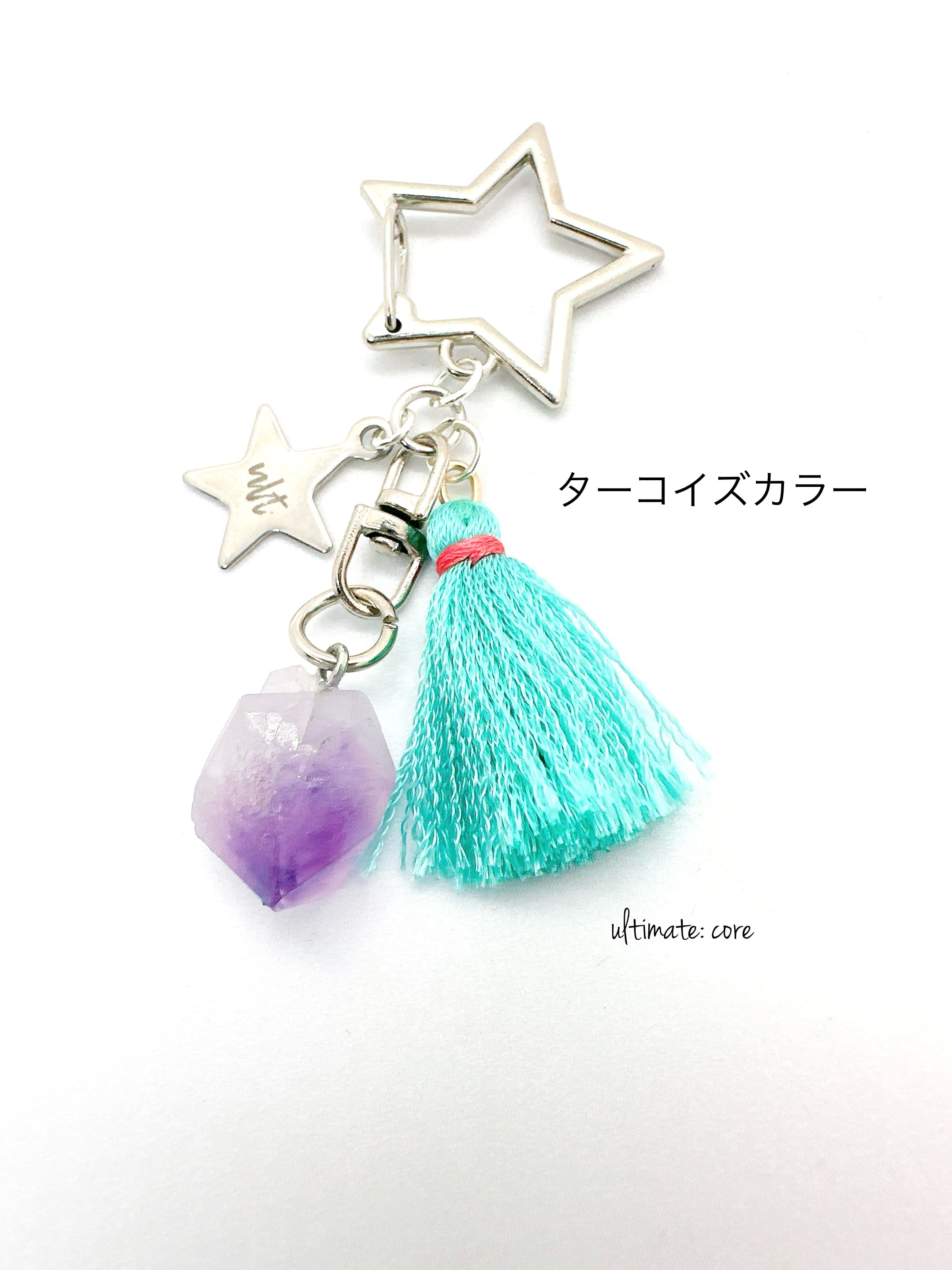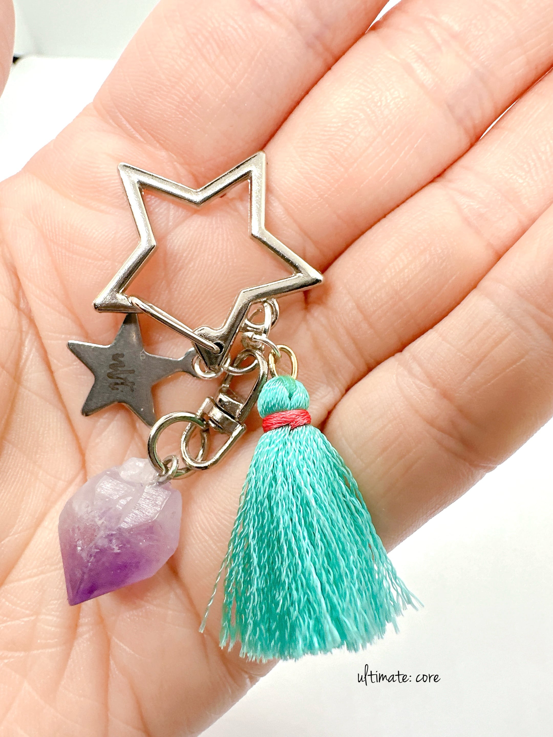 揺れるタッセルと星に、天然石のアメジストをプラスしたキーチャーム。